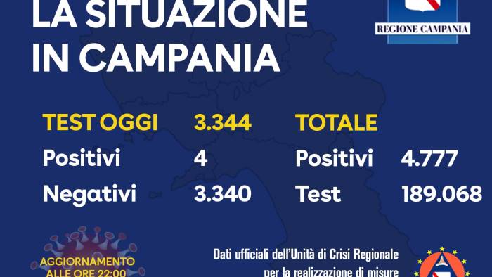L'Unità di Crisi della Regione Campania comunica che sono pervenuti i seguenti dati: