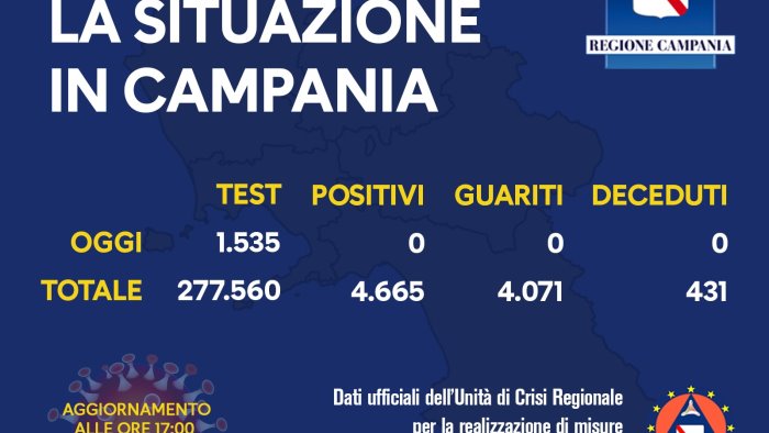 Ancora un sospiro di sollievo per la Campania: anche oggi zero nuovi positivi, sugli oltre 1500 tamponi analizzati.