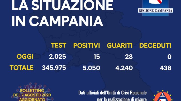 Il covid in Campania c'è ancora: sono 15 i nuovi positivi di oggi, su oltre duemila tamponi analizzati come specificato dal bollettino dell'Unità di Crisi della Protezione Civile. E' il dato più alto della settimana.