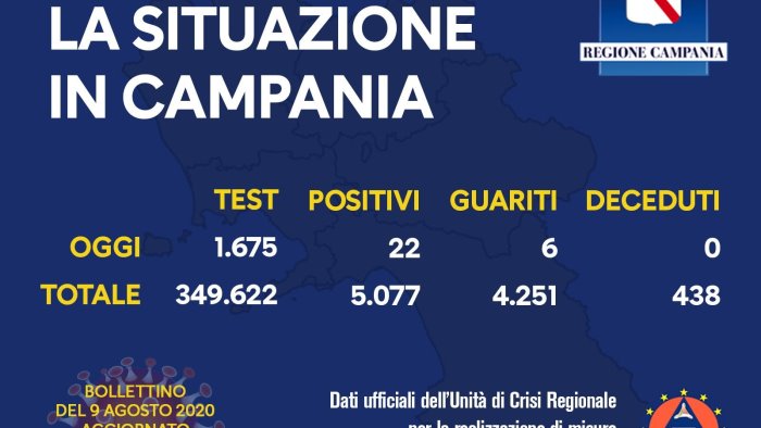 Si chiude male la settimana: dopo giorni con numero di nuovi casi sempre limitato arriva l'impennata del fine settimana. Sono 22 i nuovi positivi nelle ultime 24 ore in Campania su 1700 tamponi analizzati. Sei i nuovi guariti.