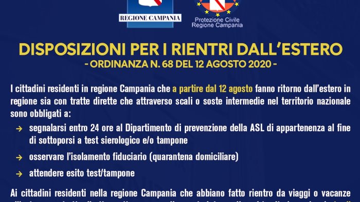 Diverso il discorso per quanto attiene agli italiani: "I nostri concittadini partiti per lavoro o per vacanza, quando rientrano, hanno ovviamente attività di relazioni ampie e incontrollate con familiari, conoscenti, amici? e possono dunque diventare agenti imprevedibili di contagio, come è già accaduto ripetutamente. Si ritiene utile incoraggiare in questa fase la permanenza in Italia per dare respiro alle nostre strutture turistiche. Sarebbe davvero assurdo portare risorse all’estero e importare il contagio in Italia. Ovviamente, chi certifica di aver già fatto il tampone può normalmente rientrare senza problemi. In ogni caso ci si può rivolgere all’Asl di appartenenza o al medico di famiglia - non agli ospedali - e farlo rapidamente (tabella in foto).
