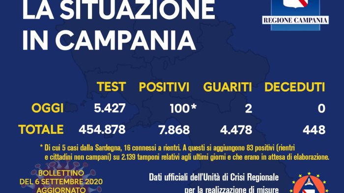 A questi si aggiungono 83 positivi (rientri e cittadini non campani) su 2.139 tamponi relativi agli ultimi giorni e che erano in attesa di elaborazione.