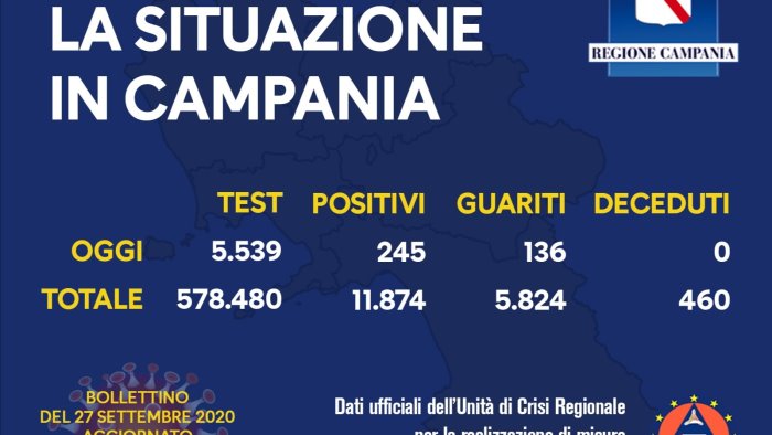 Non cala il numero dei positivi in Campania, o almeno non in maniera significativa: sempre stabilmente sopra i 200 con un numero di tamponi leggermente inferiore rispetto a quelli dei giorni precedenti. Sono 245 i positivi, mentre non si registrano nuovi decessi e 136 sono i nuovi guariti sul territorio regionale.