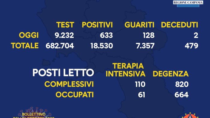 Rimane alto ma non come a metà della scorsa settimana il numero dei casi covid in Campania. Sono 633 i nuovi positivi, con 9232 tamponi processati. Purtroppo si registrano anche 2 nuovi decessi. 128 i nuovi guariti.