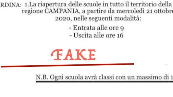 L'ultimo fotomontaggio su un'ordinanza regionale, con una improbabile limitazione delle classi ad un massimo di 10 alunni causa covid, e la viralità con cui si è diffusa tra chi l'ha ritenuta vera, ha spinto la Regione Campania ad intervenire spiegando l'assoluta infondatezza della notizia in questione e annunciando che chi falsificia ordinanze regionali ingenerando panico sarà denunciato.