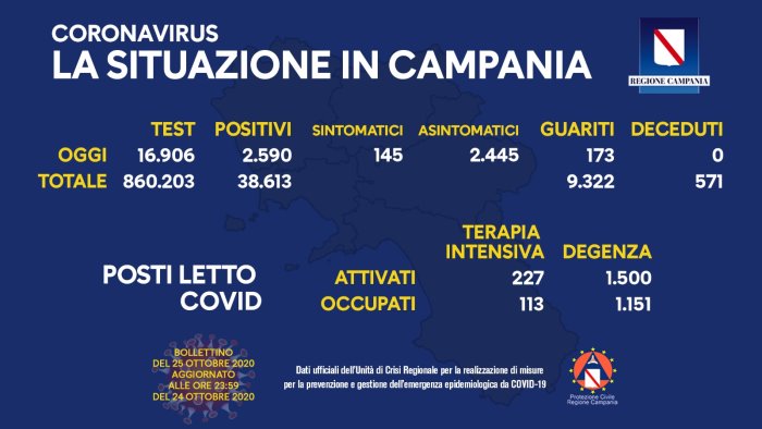 Ancora altissimo il numero dei positivi in Campania: sono 2590, per fortuna senza nessun decesso. 173 sono i guariti