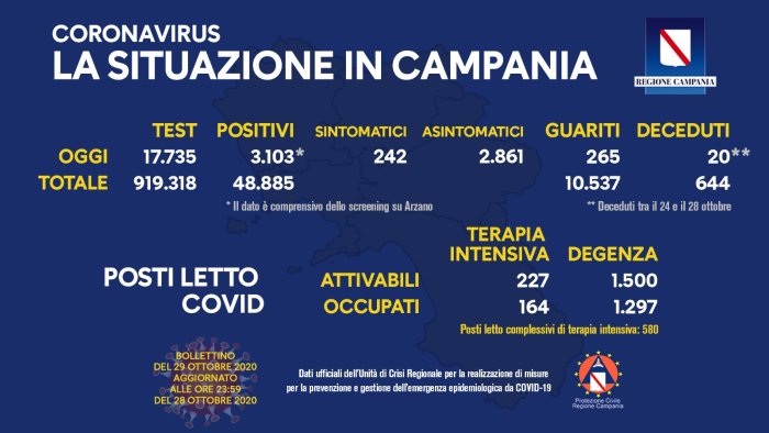20 le persone decedute tra il 24 e il 28 ottobre. In totale 644. I guariti invece sono 265 per un totale di 10.537. Il dato è comprensivo dello screening su Arzano