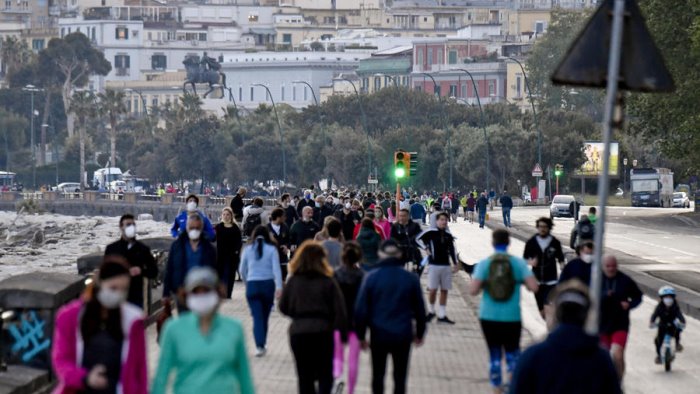 Il lockdown ipotizzato in queste ore per Napoli sembra essere una lontana ipotesi se si guarda alla folla che, approfittando della calda giornata di sole, e' scesa in strada a godersi una passeggiata sul lungomare. Tutti con la mascherina protettiva: molti napoletani, pochi i turisti, hanno raggiunto via Caracciolo per concedersi una pausa dal pesante clima di preoccupazioni legata al dilagare del virus covid-19. A rendere ancora di piu' caotica ed affollata la scena, le fila di auto che da giorni, a causa della chiusura del tunnel della Vittoria, sono dirottate sulla strada costiera dell'isola pedonale con una marcia a passo d'uomo. La giornata di oggi da' il via al week-end di Ognissanti che, tempo permettendo, lascia prevedere la stessa affluenza su strade cittadine e vicoli del centro storico.