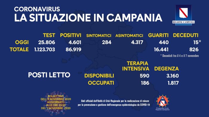Nuovo record in Campania con 4601 positivi su 25806 tamponi analizzati. 15 i nuovi decessi, mentre 440 sono i guariti