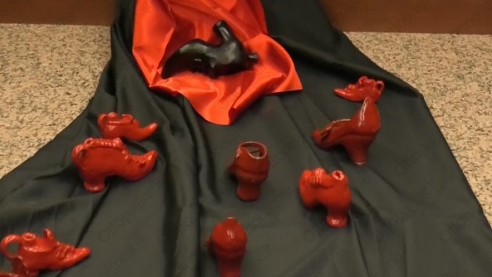 Nella foto le scarpette rosse realizzate ad Ariano Irpino dal ceramista Luigi Russo.