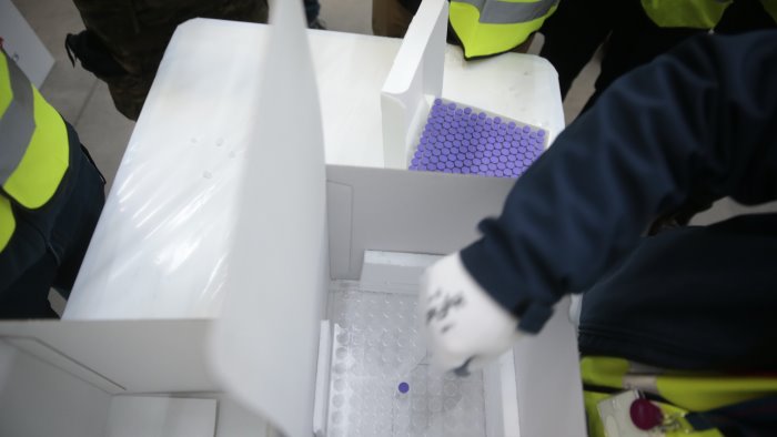 Arrivate alle 8.30 circa all'aeroporto militare di Capodichino a Napoli nuove scorte di vaccino anti-Covid Pfizer. Il furgone del corriere e' scortato da volanti della polizia. la campagna vaccinale in campania dunque dovrebbe ripendere già in giornata, dopo il breve stop inferto dall'esaurimento delle fiale. Dopo l'annuncio del governatore De Luca che aveva chiesto al commissario Domenico Arcuri di inviare al più presto altri vaccini e personale per l'inoculazione, questa mattina sono arrivati i nuovi carichi. La Campania ha fatto registrare un primato nazionale per la vaccinazione anti covid 19 . Ieri erano stati vaccinati oltre 60mila tra medici e operatori sanitari.