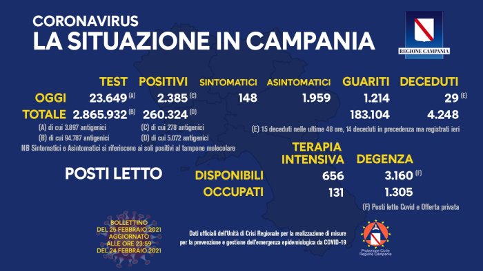 Sono 2.385 i nuovi casi di Coronavirus in Campania - di cui 278 casi identificati da test antigenici rapidi - a fronte dei 23.649 tamponi analizzati (di cui 3.897 antigenici): questi sono i dati contenuti nel bollettino odierno diramato come di consueto dall'Unità di Crisi.
