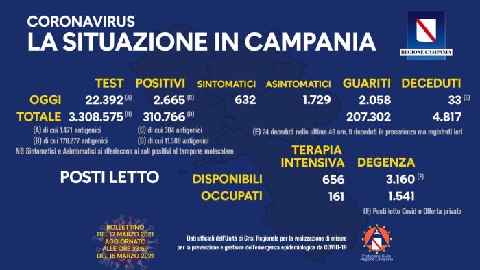 Sono 2.665 i nuovi casi di Coronavirus in Campania - di cui 466 casi identificati da test antigenici rapidi - a fronte dei 22.392 tamponi analizzati (di cui 1.471 antigenici): questi sono i dati contenuti nel bollettino odierno diramato come di consueto dall'Unità di Crisi.