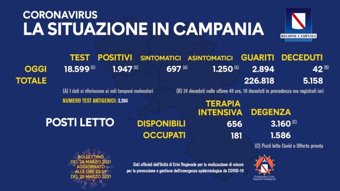 Sono 1.947 i nuovi casi di Coronavirus in Campania a fronte dei 18.599 tamponi analizzati: questi sono i dati contenuti nel bollettino odierno diramato come di consueto dall'Unità di Crisi.
