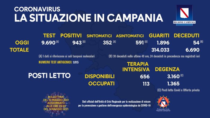 Sono 943 i nuovi casi di Coronavirus in Campania a fronte dei 9.690 tamponi analizzati: questi sono i dati contenuti nel bollettino odierno diramato come di consueto dall'Unità di Crisi. Risale il tasso di positività: al 9,73%