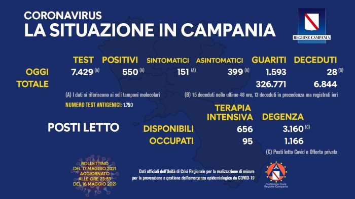 Nelle ultime 24 ore si registrano ancora 28 morti (sono 6.844 i decessi dall'inizio della pandemia). I guariti sono invece 1.593. Mentre dall'inizio della pandemia il totale dei guariti si attesta a 326.771