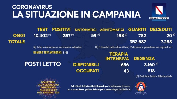Sono 257 i nuovi casi di Coronavirus in Campania a fronte dei 10.402 tamponi analizzati: questi sono i dati contenuti nel bollettino odierno diramato come di consueto dall'Unità di Crisi. Il tasso di incidenza oggi si attesta dunque al 2,47%, in lieve calo rispetto a ieri.
