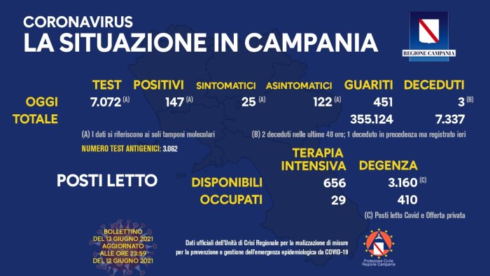 Il nuovo bollettino reso noto dall'Unità di Crisi della regione consegna alla Campania nuovi 147 positivi al Coronavirus. Di questi, 122 sono asintomatici e 25 sintomatici. Sono stati 7.072 i tamponi molecolari analizzati. I tamponi antigenici, invece, 3.062. Resta stabile, dunque, l'indice di positività. Il tasso di incidenza, che non tiene conto dei test antigenici, si attesta al 2,07%, ieri era al 2.5%.