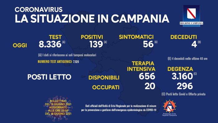 Sono 139 i nuovi casi di Coronavirus in Campania a fronte dei 8.336 tamponi analizzati: questi sono i dati contenuti nel bollettino odierno diramato come di consueto dall'Unità di Crisi. Nelle ultime 24 ore si registrano ancora 4 morti.