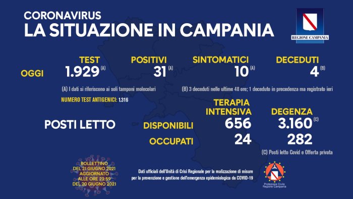Sono 31 i nuovi casi di Coronavirus in Campania a fronte dei 1.929 tamponi analizzati: questi sono i dati contenuti nel bollettino odierno diramato come di consueto dall'Unità di Crisi. Nelle ultime 24 ore si registrano ancora 4 morti.