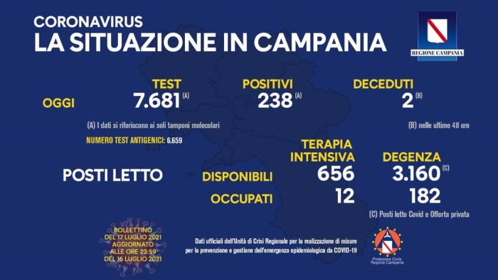 Sono 238 i nuovi casi di Coronavirus in Campania a fronte dei 7.681 tamponi analizzati: questi sono i dati contenuti nel bollettino odierno diramato come di consueto dall'Unità di Crisi. Si registrano 2 decessi nelle ultime 48 ore.