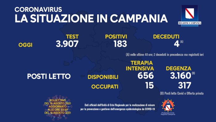 Sono 183 i nuovi casi di Coronavirus in Campania a fronte dei 3.907 tamponi analizzati: questi sono i dati contenuti nel bollettino odierno diramato come di consueto dall'Unità di Crisi. Si registrano 2 deceduti nelle ultime 48 ore. Il tasso di positività aumenta dal 3,4% di ieri al 4,68% ma a fronte di un calo di test effettuati.