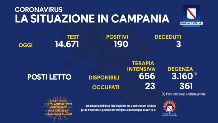 Sono 190 i nuovi casi di Coronavirus in Campania a fronte dei 14.671 tamponi analizzati: questi sono i dati contenuti nel bollettino odierno diramato come di consueto dall'Unità di Crisi. Si registrano 3 deceduti nelle ultime 48 ore.