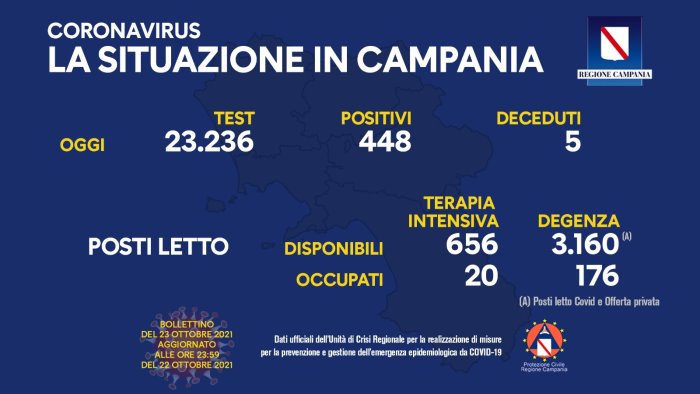 E' un bollettino preoccupante quello diramato oggi dalla sala operativa della Regione Campania. I dati sono aggiornati alle 23.59 di ieri. I positivi complessivamente 448 su 23.236 tamponi effettuati. 5 in totale le persone decedute.