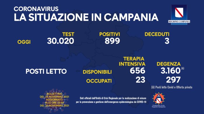 Sono 899 i nuovi casi di Coronavirus in Campania a fronte dei 30.020 tamponi analizzati: questi sono i dati contenuti nel bollettino odierno diramato come di consueto dall'Unità di Crisi. Si registrano 3 deceduti nelle ultime 48 ore.
