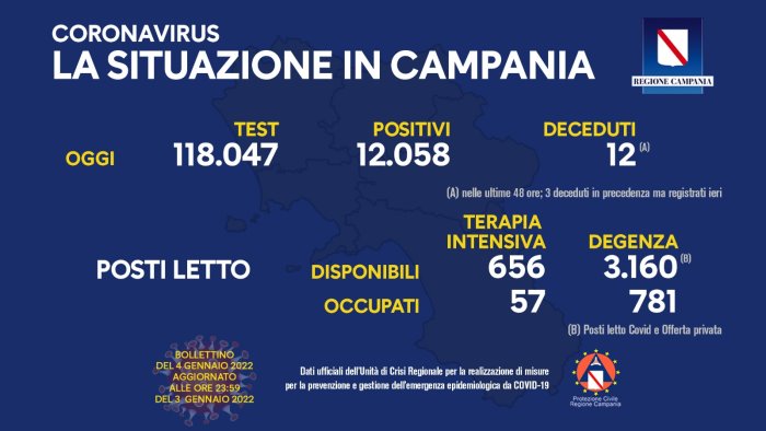 Sono 12.058 i nuovi casi di Coronavirus in Campania a fronte dei 118.047 tamponi analizzati: questi sono i dati contenuti nel bollettino odierno diramato come di consueto dall'Unità di Crisi. Si registrano 12 decessi nelle ultime 48 ore.