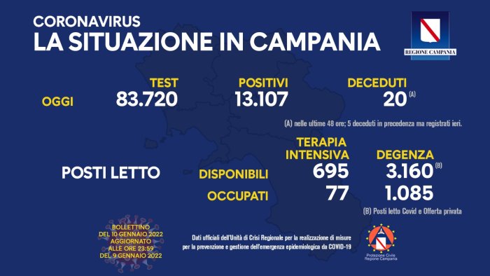 Sono 13.107 i nuovi casi di Coronavirus in Campania a fronte dei 83.720 tamponi analizzati: questi sono i dati contenuti nel bollettino odierno diramato come di consueto dall'Unità di Crisi. Si registrano 20 decessi nelle ultime 48 ore.