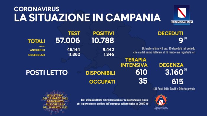 Sono 10.788 i nuovi casi di Coronavirus in Campania a fronte dei 57.006 tamponi analizzati: questi sono i dati contenuti nel bollettino odierno diramato come di consueto dall'Unità di Crisi. Si registrano 9 decessi nelle ultime 48 ore.