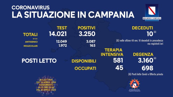 Sono 3.250 i nuovi casi di Coronavirus in Campania a fronte dei 14.021 tamponi analizzati: questi sono i dati contenuti nel bollettino odierno diramato come di consueto dall'Unità di Crisi. Si registrano 10 decessi nelle ultime 48 ore.