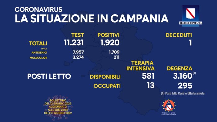 Il nuovo bollettino dell'Unità di Crisi Regionale consegna alla Campania nuovi 1.920 positivi su 11.231 test effettuati. Di questi 7.957 sono antigenici e 3.274 sono i molecolari. Nel nuovo report si registra anche un decesso.