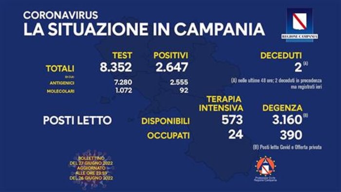 Sono 2.647 i positivi del giorno rilevati oggi in Campania a fronte di 8.352 test processati (7.280 antigenici e 1.072 molecolari). Hanno dato esito positivo 2.555 test antigenici e 92 tamponi molecolari. I contagi sfondano la quota del 30 per cento.A renderlo noto è l'unità di crisi regionale.