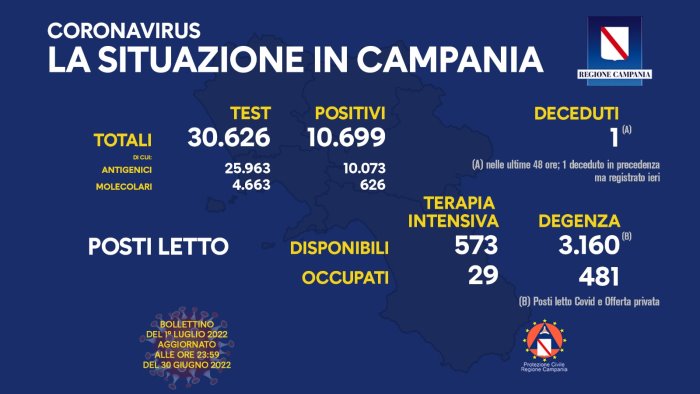 Sono 10.699 i nuovi positivi al Covid in Campania, su 30.626 test eseguiti nella giornata di ieri. Il tasso di incidenza è del 34,93%. Si registra 1 decesso nella ultime 48 ore e 1 registrato ieri. Sale a quota 29 l'occupazione dei posti letto in terapia intensiva; quella delle degenze 481.