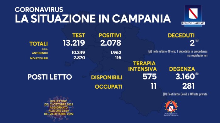 Sono 2.078, su 13.219 test eseguiti, i positivi al Covid in Campania.