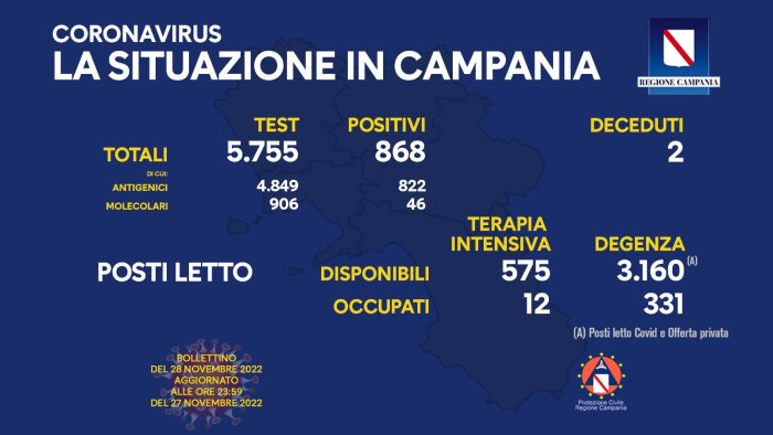 Il nuovo bollettino consegna fa registrare in Campania 868 positivi su 5.755 tamponi esaminati. Di questi, 822 sono risultati positivi al tampone antigenico mentre 46 sono risultati positivi al tampone molecolare. L'ultimo aggiornamento dell'Unità di Crisi regionale registrano 2 nuovi decessi.