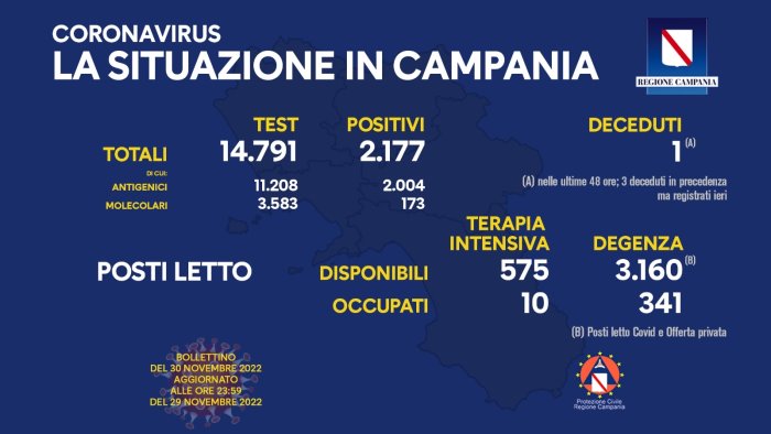 Il nuovo bollettino consegna fa registrare in Campania 2.177 positivi su 14.791 tamponi esaminati. Di questi, 2.004 sono risultati positivi al tampone antigenico mentre 173 sono risultati positivi al tampone molecolare. L'ultimo aggiornamento dell'Unità di Crisi regionale registra 1 nuovo decesso.