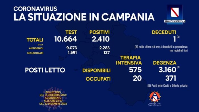 Sono 2410 i nuovi positivi al Covid-19 registrati nelle ultime 24 ore in Campania a fronte di 10.664 tamponi processati. Questi i dati dell'ultimo bollettino diffuso dall'Unità di crisi regionale. Il tasso di incidenza sale al 22.6%.
