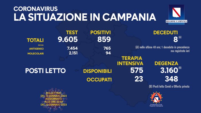 Il nuovo bollettino consegna fa registrare in Campania 859 positivi su 9.605 tamponi esaminati. Di questi, 765 sono risultati positivi al tampone antigenico mentre 94 sono risultati positivi al tampone molecolare. L'ultimo aggiornamento dell'Unità di Crisi regionale registra 8 nuovi decessi.