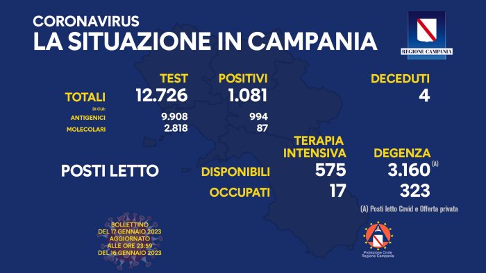 Il nuovo bollettino consegna fa registrare in Campania 1.081 positivi su 12.726 tamponi esaminati. Di questi, 994 sono risultati positivi al tampone antigenico mentre 87 sono risultati positivi al tampone molecolare. L'ultimo aggiornamento dell'Unità di Crisi regionale registra 4 nuovi decessi.