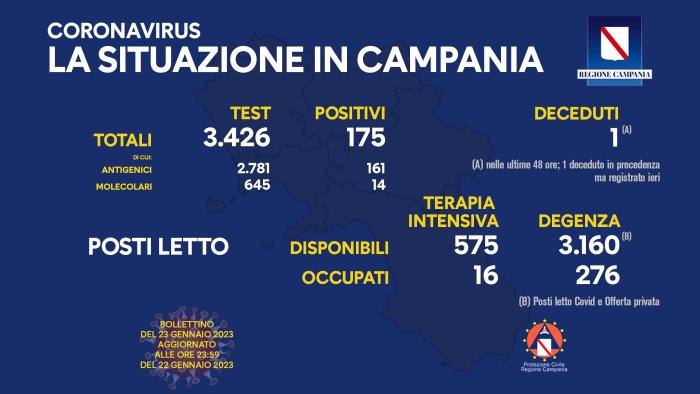 Il nuovo bollettino consegna fa registrare in Campania 175 positivi su 3.426 tamponi esaminati. Di questi, 161 sono risultati positivi al tampone antigenico mentre 14 sono risultati positivi al tampone molecolare. L'ultimo aggiornamento dell'Unità di Crisi regionale registra 1 nuovo decesso.
