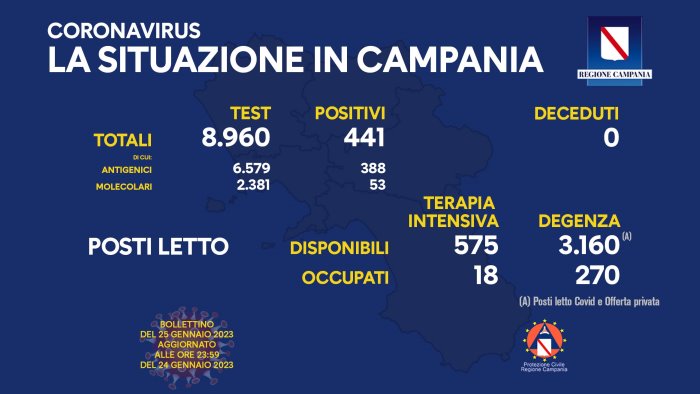 Il nuovo bollettino consegna fa registrare in Campania 441 positivi su 8.960 tamponi esaminati. Di questi, 388 sono risultati positivi al tampone antigenico mentre 53 sono risultati positivi al tampone molecolare. Nessun nuovo decesso.