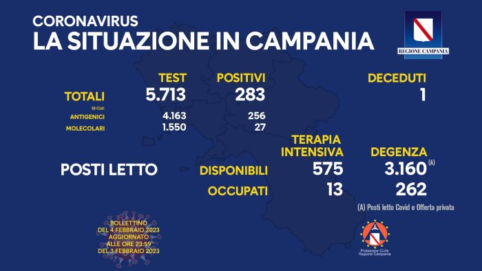 Il nuovo bollettino consegna fa registrare in Campania 283 positivi su 5.713 tamponi esaminati. Di questi, 256 sono risultati positivi al tampone antigenico mentre 27 sono risultati positivi al tampone molecolare. Nessun nuovo decesso.