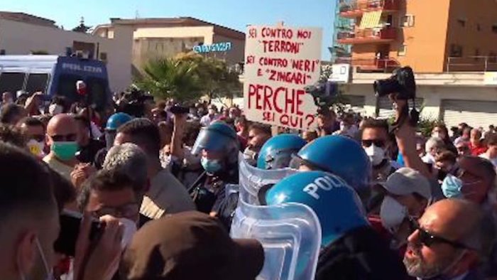 Scontri, cariche, feriti in un clima di fortissima tensione stasera a Mondragone all'arrivo di Matteo Salvini. Decine di manifestanti hanno contestato il leader della Lega al grido di 'sciacallo', qualcuno dalla folla ha lanciato dell'acqua all’indirizzo dell’ex ministro che ha subito replicato: "Bene, ho anche caldo”.