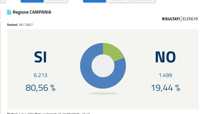 Primi dati scrutinati in Campania per il referendum: dalle prime 18 sezioni scrutinate, e dunque dai primi dati reali pervenuti si profila una netta affermazione del sì, rispetto al no.