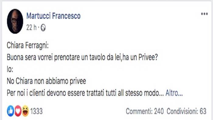 Insomma Martucci, titolare de “I masanielli”, non ha mai rimbalzato i “Ferragnez” rifiutando di dargli il privee perché clienti “come tutti gli altri”.