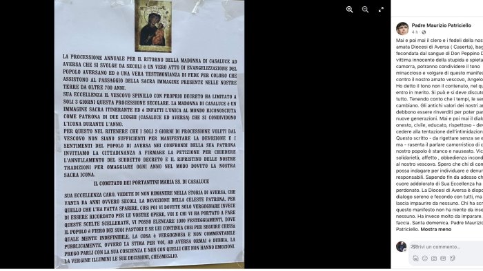 E' il tenore di un manifesto, firmato dal "Comitato dei Portantini Maria Santissima di Casaluce" nei confronti del vescovo Angelo Spinillo per aver "limitato a soli tre giorni" la processione annuale per la Madonna di Casaluce ad Aversa, che nella storia ha sempre ebbe una durata ben superiore. "Scelte scellerate", accusano i contestatori che annunciano anche di voler lanciare una petizione. Un testo che ha suscitato scalpore in tutti i comuni della diocesi. Secondo don Maurizio Patriciello, parroco di Caivano sotto scorta che da anni si batte contro la criminalità organizzata, quel manifesto "rasenta il parlare camorristico di cui il nostro popolo è stanco e nauseato", scrive su Fb, dove esprime anche "vicinanza, solidarietà, affetto, obbedienza incondizionata" al vescovo. Il prete "anti-roghi" (così soprannominato per il suo ambientale nella "Terra dei fuochi") invita chi di competenza a indagare "per individuare e denunciare i responsabili, sapendo fin da adesso che il buon cuore addolorato di Sua Eccellenza ha già impegno perdonato". "La Diocesi di Aversa è disponibile al dialogo sereno e fecondo con tutti, - ricorda don Patriciello - ma non si lascia impaurire da nessuno. Chi ha scritto questo manifesto non ha niente da insegnare. A nessuno.