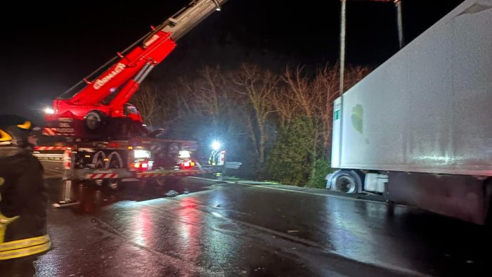 Questa notte, verso le ore 00:30, una squadra dei Vigili del Fuoco del Comando provinciale di Caserta, proveniente dal distaccamento di Teano, è intervenuta sulla SS6, lungo il tratto di strada che collega San Pietro Infine con Isernia, nel comune di San Pietro Infine, per un incidente stradale. Giunti immediatamente sul posto i Vigili del Fuoco hanno trovato un autoarticolato il cui conducente, per cause da accertare, durante la marcia perdeva il controllo del grosso veicolo finendo la sua corsa, senza coinvolgere altri veicoli, contro il guardrail ed all'esterno della carreggiata, rimanendo incastrato tra le lamiere dell'abitacolo.